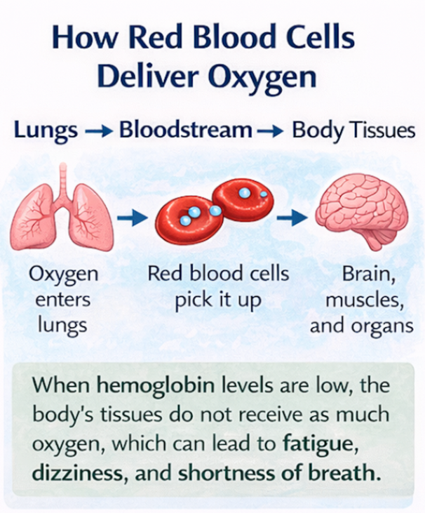 Your body needs oxygen to produce energy and keep organs, muscles, and the brain working properly. Oxygen enters the body through the lungs and then travels through the bloodstream to reach every cell. Special cells in the blood called red blood cells carry this oxygen. Inside each red blood cell is a protein called hemoglobin, which binds to oxygen and transports it from the lungs to the rest of the body.
